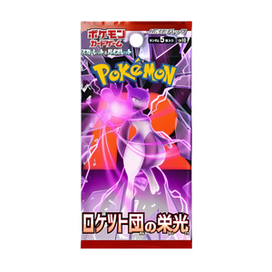 Bustina del set Pokémon The Glory of Team Rocket (JP), raffigurante Mewtwo circondato da energia psichica e fulmini su sfondo oscuro con il logo Pokémon. Bustina del set Pokémon The Glory of Team Rocket (JP), con Giovanni seduto su una poltrona circondato da Pokémon come Nidoking, Lucario e altri, con lo sfondo del logo 'R' di Team Rocket.