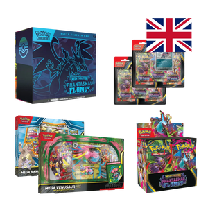Phantasmal Flames Bundle completo con Elite Trainer Box, Booster Box e Premium Collections Elite Trainer Box Phantasmal Flames Mega Evolution con Mega Charizard X ex artwork