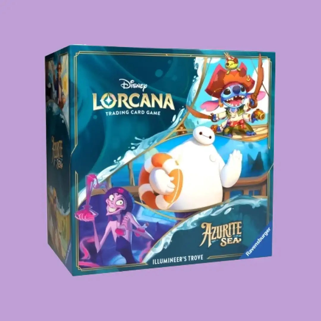 Confezione frontale del Disney Lorcana Azurite Sea Illumineer's Trove con illustrazioni di Stitch, Baymax e Yzma Retro del Disney Lorcana Azurite Sea Illumineer's Trove con booster packs e carte del gioco di trading
