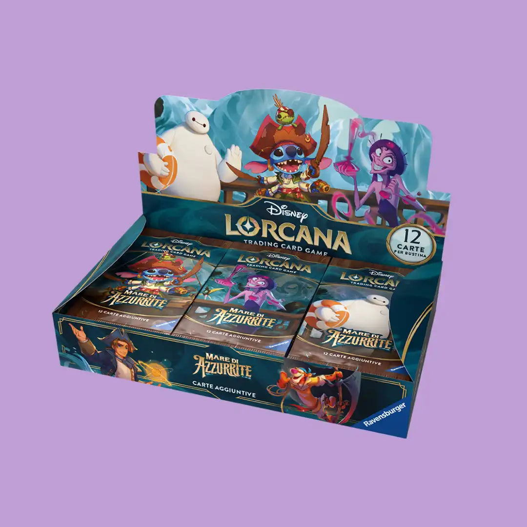 Disney Lorcana Mare di Azzurrite Display Booster Box aperto con illustrazioni di Stitch, Baymax e Yzma Confezione chiusa del Disney Lorcana Mare di Azzurrite Display Booster Box con 12 carte per bustina (ITA)