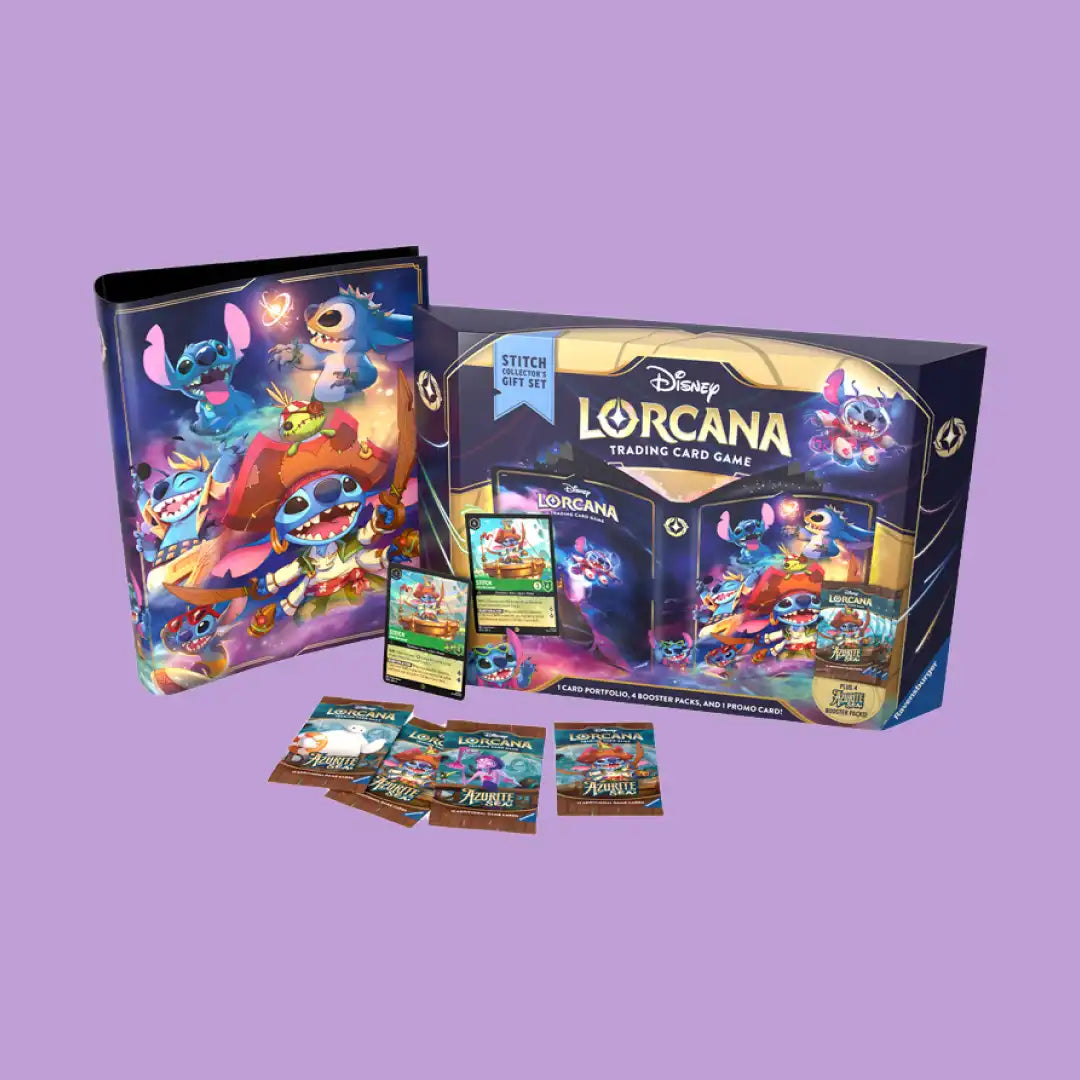 Confezione frontale del Disney Lorcana Stitch Collector's Gift Set con illustrazioni di Stitch e carte del gioco di trading Azurite Sea