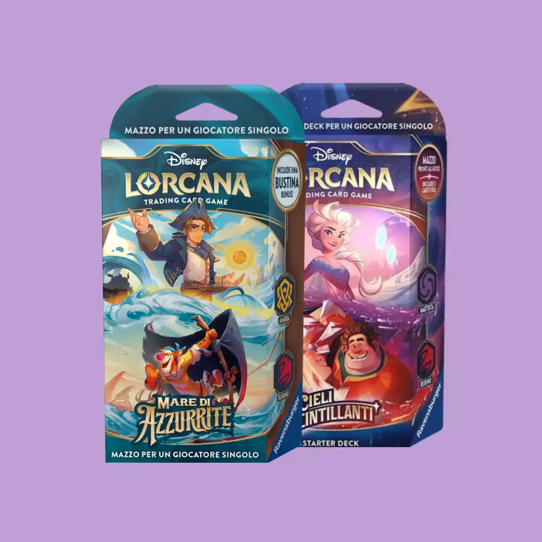 Box Starter Decks di Disney Lorcana Leggende in italiano con mazzi precostituiti Smeraldo/Rubino e Ambra/Zaffiro.