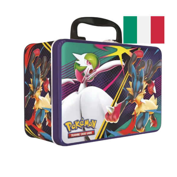 - 1 sturdy and durable metal collector chest - 6 Italian Pokémon TCG booster packs (2x Destined Rivals, 2x Journey Together, 2x Mega Evolution) - 3 exclusive foil promo cards: Ralts, Kirlia, Riolu - 1 collectible metallic Mega Lucario coin - 4 colorful sticker sheets featuring Mega Lucario, Mega Gardevoir and other Pokémon - 1 mini portfolio to store and protect favorite cards - 1 code card for Pokémon TCG Live - Over 60 total cards in Italian from pack openings - Premium artwork with Mega Gardevoir and Mega Lucario (front) - Exclusive artwork with Mega Latias and Mega Mawile (back) - Exclusive foil cards impossible to find elsewhere - Perfect for bringing collection to Italian events - Ideal for building competitive Mega Evolution decks in Italian - Guaranteed long-term collectible value - Premium packaging for shelf display